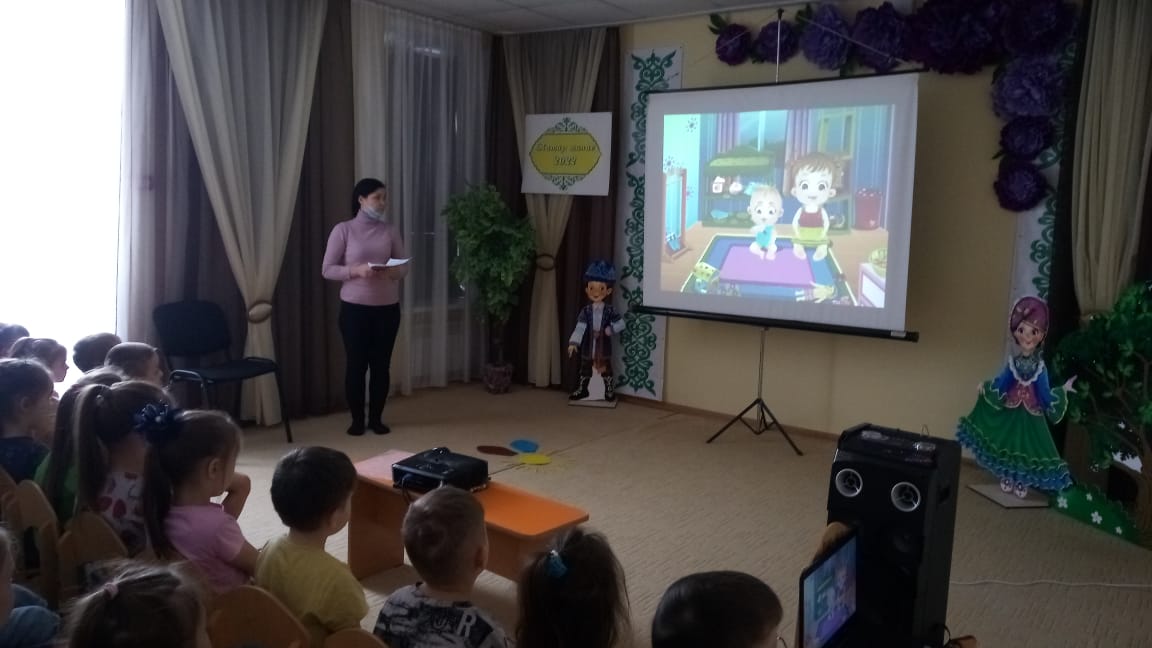 Подготовку данной кинопрограммы провела методист Сизова Гульназ Салаватовна. Были выбраны видеоролики и создана презентация согласно учету возрастных особенностей дошкольников. В ходе мероприятия была использована вопросно-ответная форма работы, а именно после просмотра мультфильма «Что такое ХОРОШО и что такое ПЛОХО?» по книге В. В. Маяковского. Дети очень активно участвовали в беседе по презентации «Правила поведения и безопасность в быту», где каждый хотел поделиться своими знаниями о понятиях «Хорошо» и «Плохо».