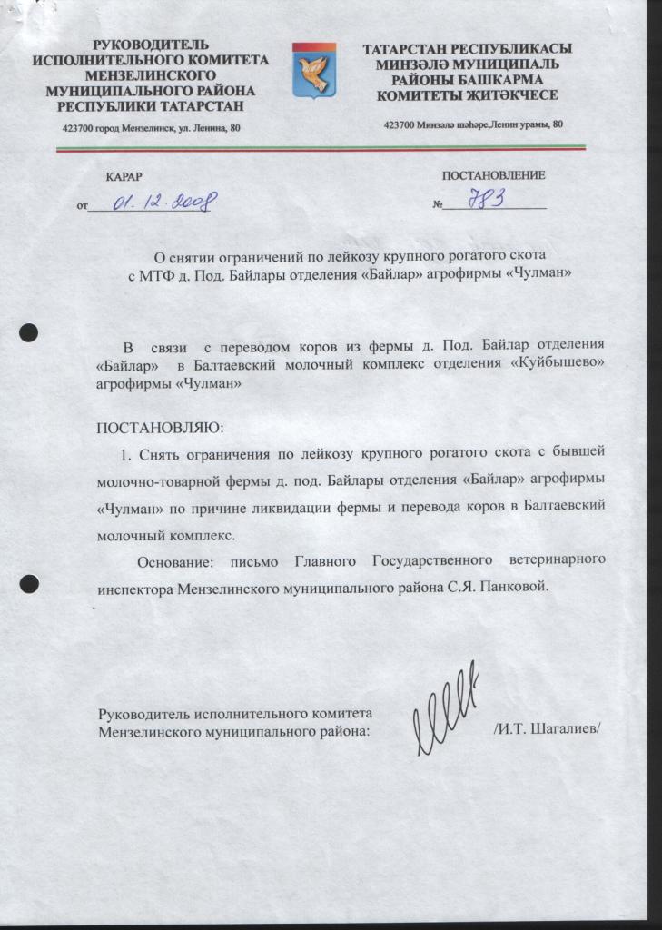 Постановление руководителя исполкома № 783 от 01.12.08 - О снятиии ограничений по лейкозу