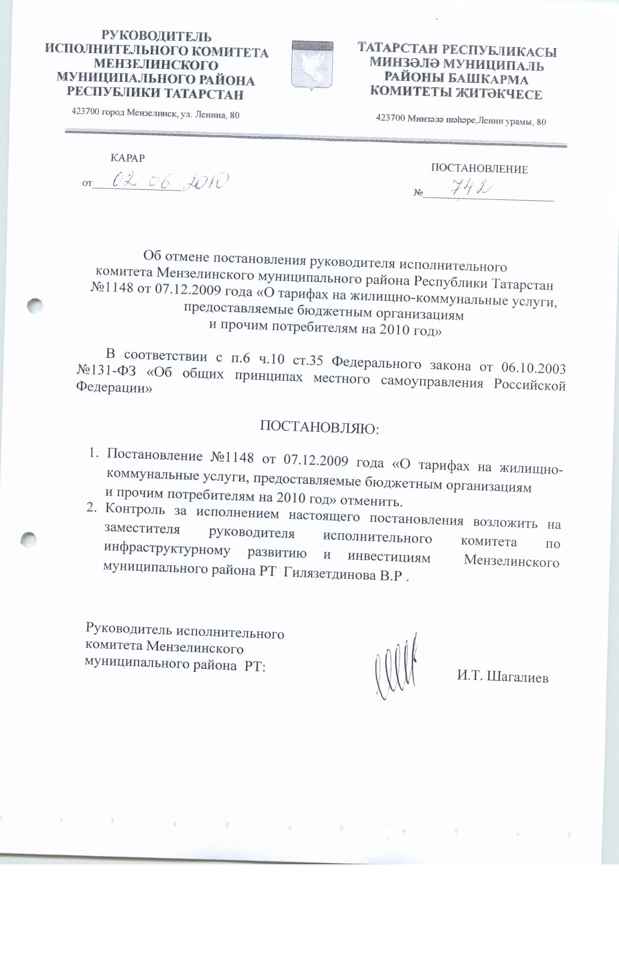 № 742 - Об отмене постановления РИК №1148 от 07.12.2009 года «О тарифах на жилищно-коммунальные услуги, предоставляемые бюджетным организациям и прочим потребителям на 2010 год»