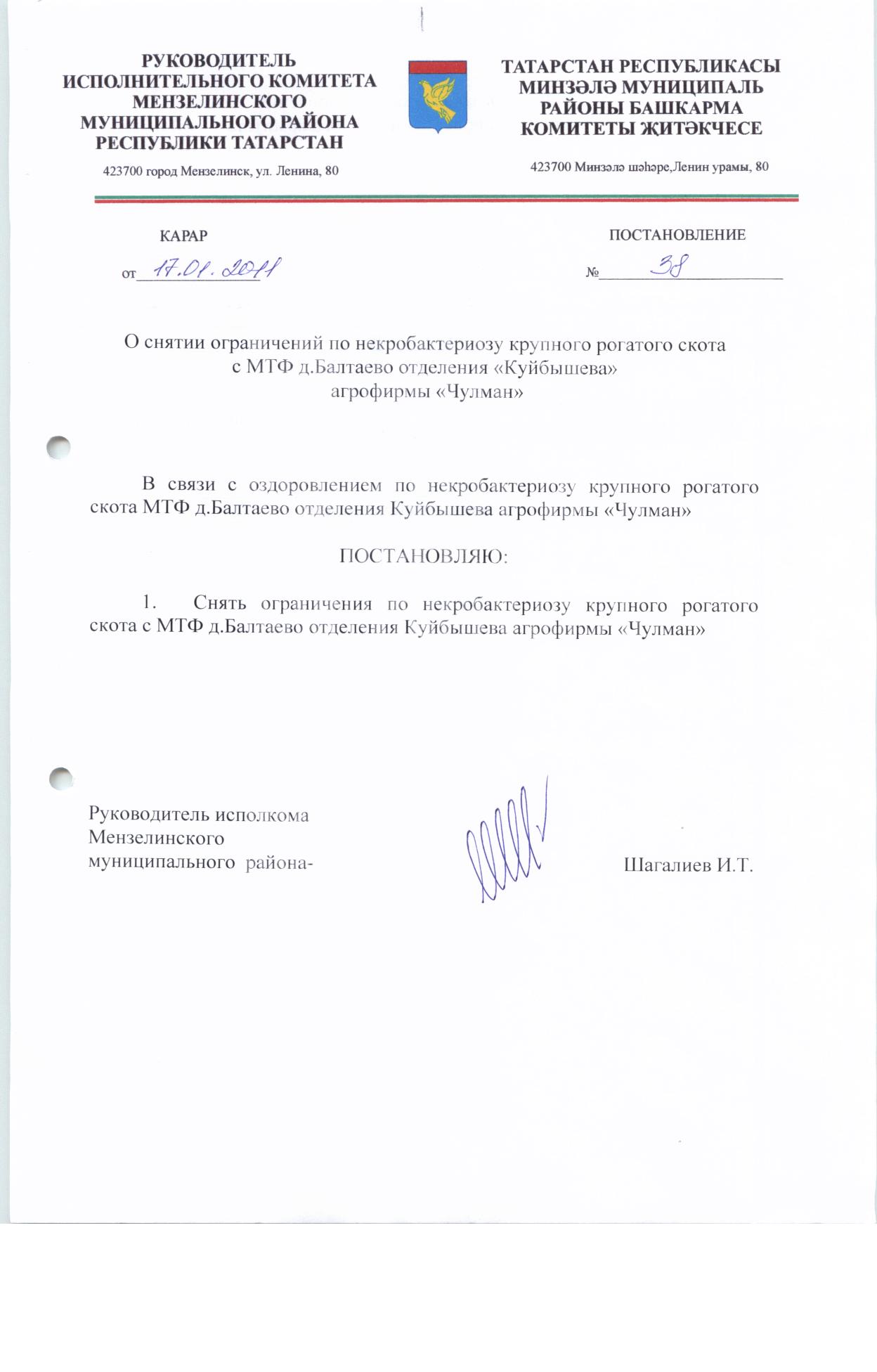 О снятии ограничений по некробактериозу крупного рогатого скота с МТФ д.Балтаево отделения «Куйбышева» Агрофирмы «Чулман»