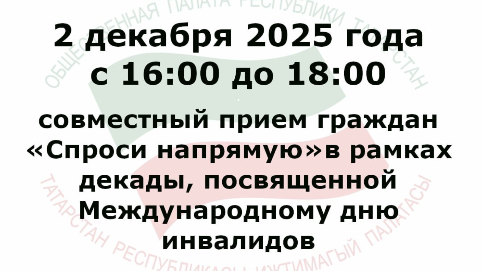 2025 елның 2 декабрендә, 16:00 сәгатьтән 18:00 сәгатькә кадәр, ТР Иҗтимагый палатасында Халыкара инвалидлар көненә багышланган декада кысаларында "Турыдан-туры сора" дип аталган гражданнарны кабул итү планлаштырыла.