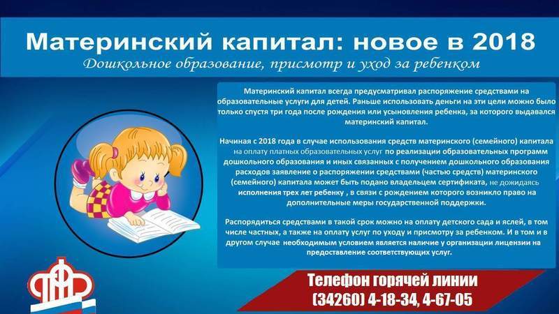 Шуны да билгеләп үтәргә кирәк, 2018 елның 1 гыйнварыннан мәктәпкәчә учреждение хезмәтләре өчен түләү акчаларын ана капиталына хокук биргән баланың туганнан соң теләсә кайсы вакытта җибәрергә мөмкин. Дәүләт программасы акчаларын балалар бакчасы (муниципаль, шәхси яки ведомство) хезмәтләре өчен түләүгә юнәлтү өчен яшәү урыны буенча Пенсия фонды идарәсенә баланы карап тоту буенча учреждение бурычларын үз эченә алган мәгариф учреждениесе белән шартнамә тапшырырга кирәк. Хезмәтләр өчен түләү килешүдә күрсәтелгән сумманы мәктәпкәчә белем бирү учреждениесе счетына күчерү юлы белән башкарыла.