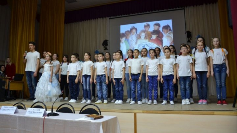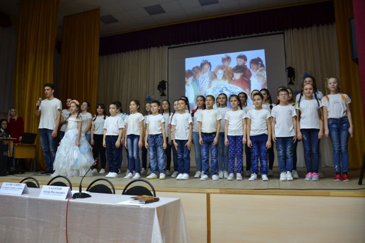 Җыенга килгән халык өчен гимназия укучылары инглиз телендә чыгыш әзерләгәннәр. Балаларны бакча яшеннән өч телгә өйрәтү - замана таләбе.
