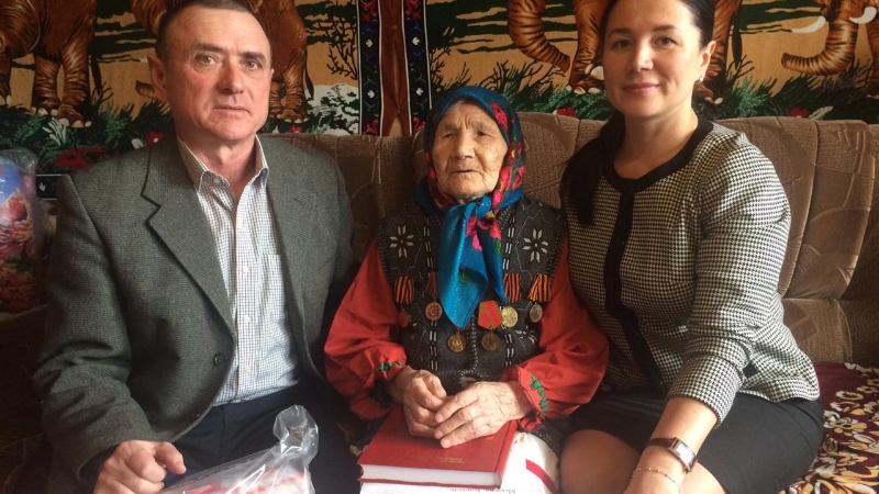 Бу көнне ветеранны истәлекле дата белән тәбрик итәргә Минзәлә муниципаль район Советы аппарат җитәкчесе Эльвира Хәбибуллина һәм Әтрәкле авыл җирлеге башлыгы Рөстәм Газизянов килде. Зур кунакларны юбиляр мари халкының милли костюмында каршы алды. Эльвира Хәбибуллин РФ Президенты Владимир Путинның котлау хатын, район башлыгы Айдар Салаховның бүләген тапшырды. Җирлек башлыгы Рөстәм Газизянов та бүләк тапшырды, юбилярга ныклы сәламәтлек, озын гомер, якыннарының кайгыртуын тоеп яшәвен теләде.