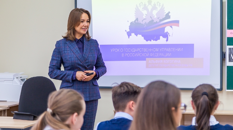 Россия Федерациясенең Дәүләт Думасы депутаты, Икътисадый сәясәт, сәнәгать, инновацияле үсеш һәм эшмәкәрлек буенча комиссия рәисе урынбасары Әлфия Когогина төбәк атнасы барышында Яр Чаллының бер мандатлы округы мәктәпләрендә Россия Федерациясендә дәүләт идарәсе турында дәресләр уздырды.