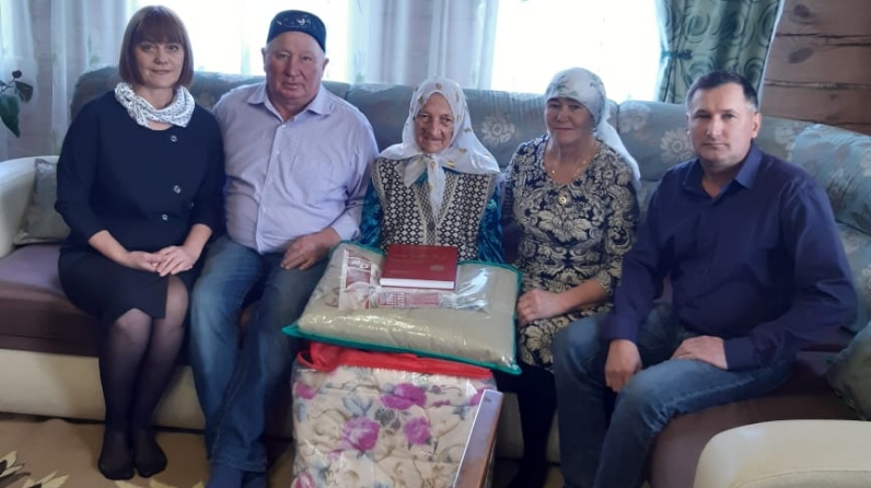 Юбилярны якын туганнары янәшәсендә социаль яклау бүлеге начальнигы Татьяна Мясникова, Иске Матвеевка авыл җирлеге башлыгы Айрат Нуриев котлады. Алар ветеранга ныклы сәламәтлек, кайгы-хәсрәтләрне урап узуын, якыннарының күңел җылысын тоеп якты көннәр кичерүен теләделәр.