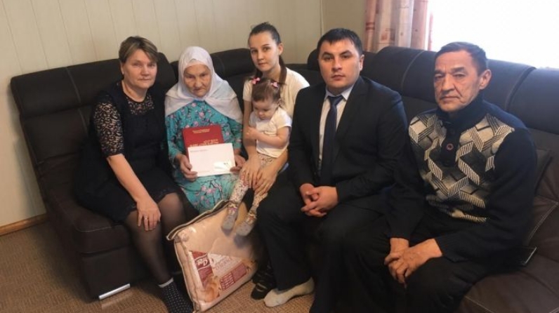 Галимә Әхмәтгата кызына Россия Федерациясе Президенты Владимир Путинның котлау открыткасын, шулай ук район башлыгы Айдар Сәлаховның истәлекле бүләегн тапшырдылар.