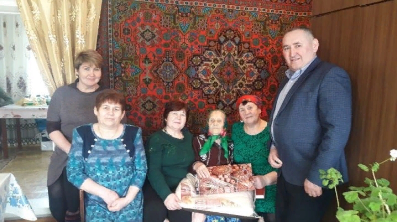 Тыл һәм хезмәт ветераны Мәмдүхә Талипова юбилее белән котларга Урыс авыл җирлеге башлыгы Фазыл Маулин килде. РФ Президенты Владимир Путин, район башлыгы Айдар Сәлахов исеменнән котлады, истәлекле бүләкләр тапшырды, иң җылы теләкләрен җиткерде.