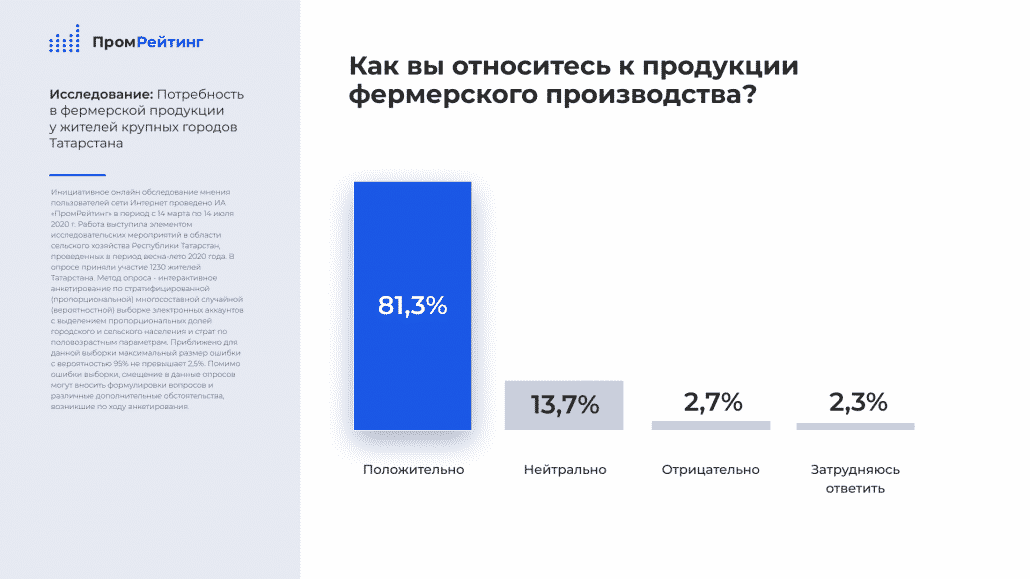 Гомумән алганда, сораштыруда катнашкан Татарстан халкының 80%тан артыгы кибетләрдәгеләрдән экологик яктан чистарак һәм табигыйрәк дип саналган фермер продукциясенә карата уңай карашта булулары турында белдерде (сораштыру шулай ук шәһәр халкының үз азык-төлек кәрҗинен нинди кибетләрдә ешрак тутыруын да күрсәтте).