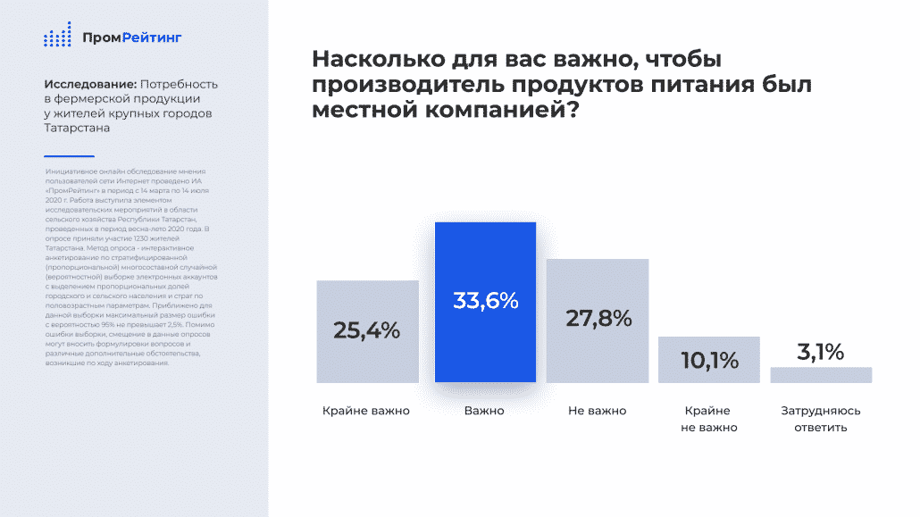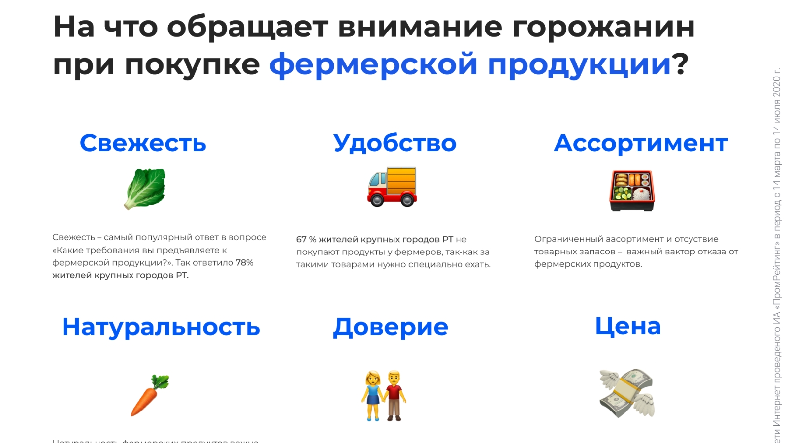 «ПромРейтинг» агентлыгы аналитиклары җирле фермер продукциясен сатып алу һәм куллану темасы буенча Татарстанның 100 меңнән артык халкы булган шәһәрләрендә яшәүчеләрдән сораштыру нәтиҗәләре буенча әнә шундый нәтиҗәгә килгәннәр.