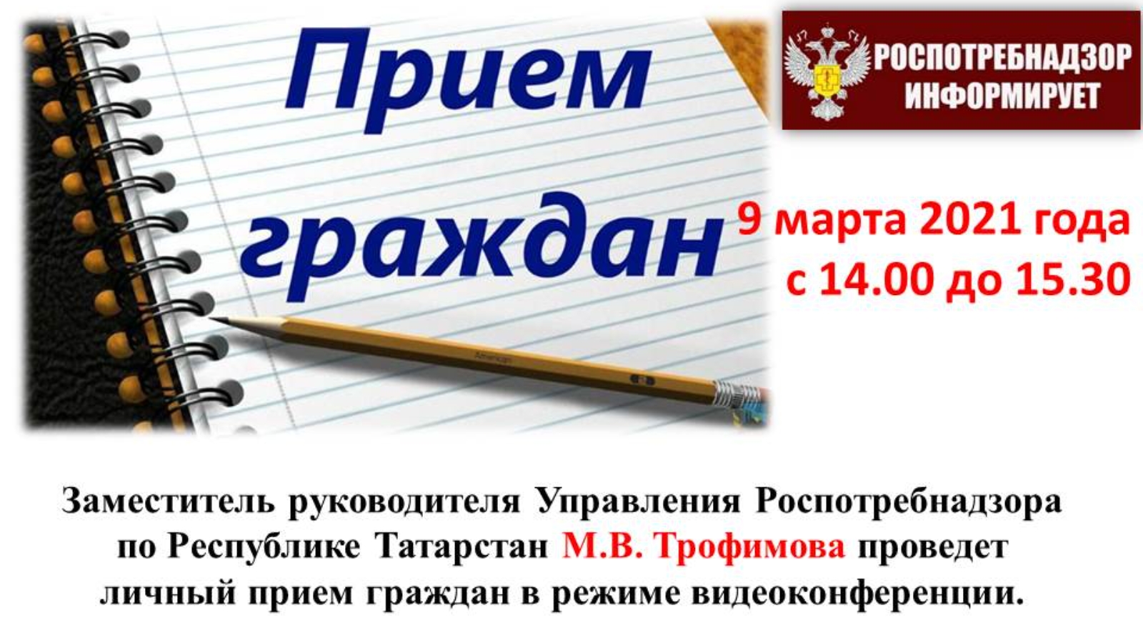 Роспотребнадзорның Татарстан Республикасы буенча Идарәсе җитәкче урынбасары М.В.Трофимова 9 мартта, 14.00 - 15.30 сәгатьләрдә Яр Чаллы шәһәрендә, Тукай, Мөслим, Минзәлә һәм Актаныш районнары халкы өчен видеоконференция элемтәсе режимында гражданнарны шәхсән кабул итә. Адресы: Яр Чаллы шәһәре, ЗЯБ поселогы, Низаметдинов ур., 14 нче йорт.
