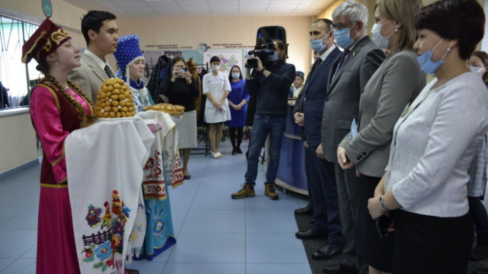 Казан кунакларын – ТР Дәүләт Советы депутатларын кулларына икмәк һәм милли ризык чәкчәк тоткан, милли костюмнар кигән укучылар төрле телләрдә сәламләделәр.
