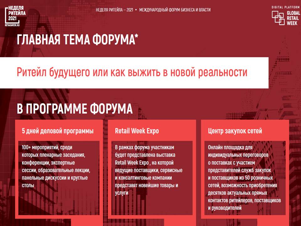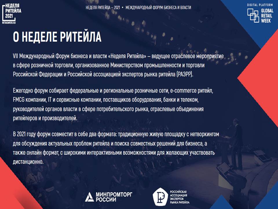 Россия Федерациясе Сәүдә һәм сәнәгать министрлыгы Россия ритейл базары экспертлары ассоциациясе белән берлектә "Россия Ритэйлы Атнасы" VII Халыкара бизнес һәм хакимият форумын уздыра.