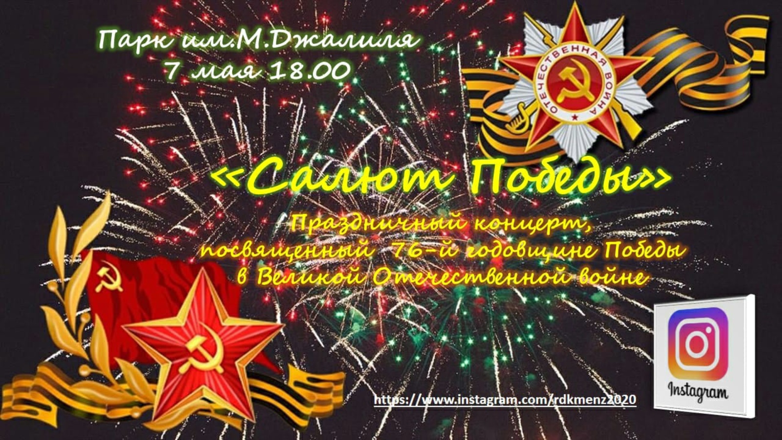 Хөрмәтле Минзәлә районы халкы һәм кунаклар! Сезне 7 майда Муса Җәлил исемендәге паркка Бөек Ватан сугышында Җиңүнең 76 еллыгына багышланган "Җиңү салюты" бәйрәм концертына чакырабыз.