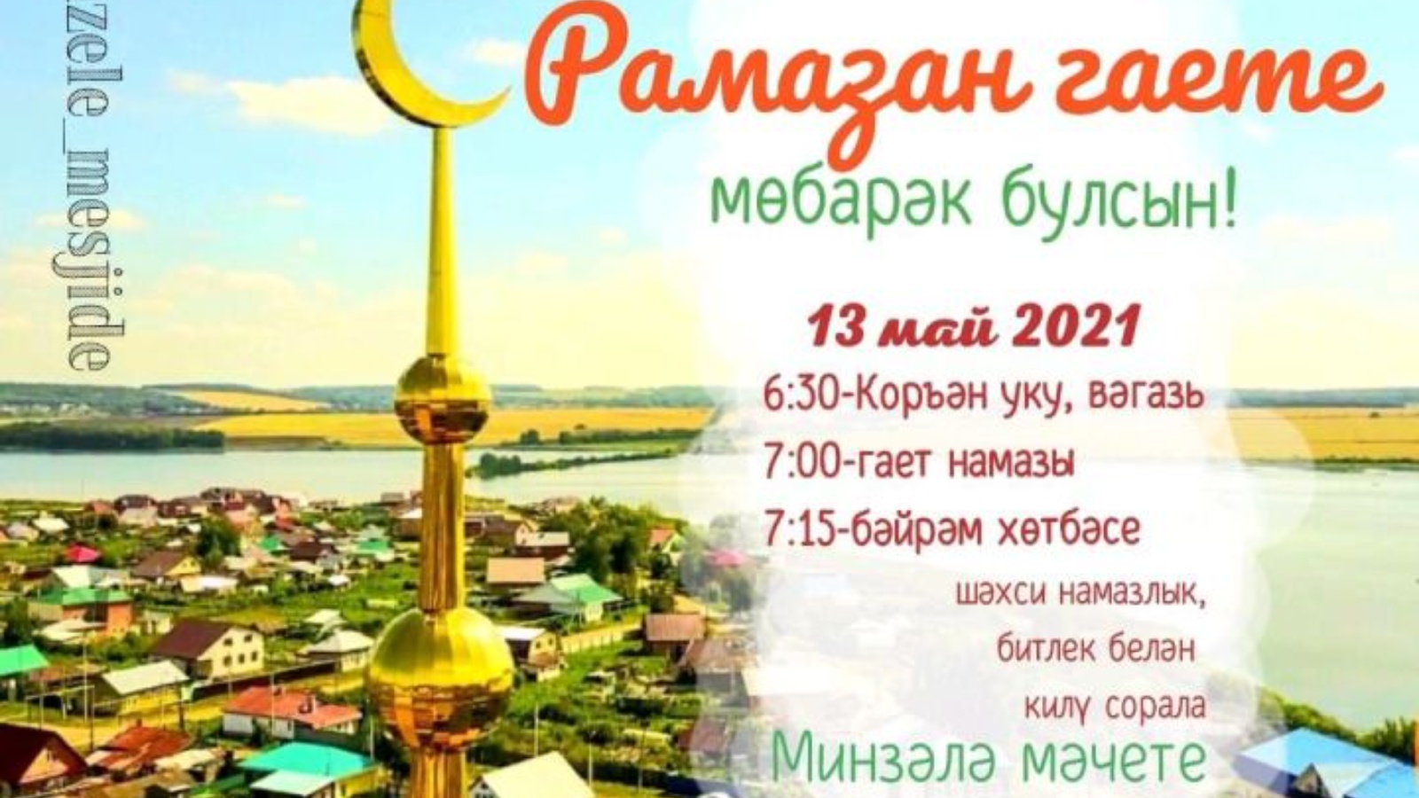 Ураза бәйрәме быел 13 майга туры килә. Шәһәр мәчетендә иртәнге 6.30 сәгатьтә иртәнге вәгазь уку, 7.00 - намаз.