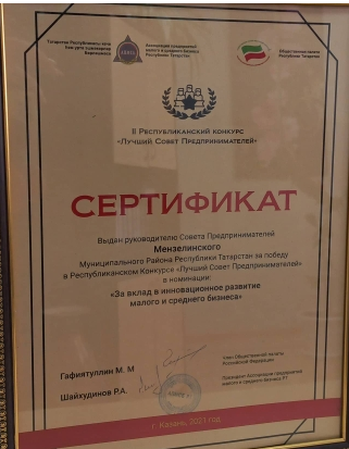 Минзәлә муниципаль районы "Кече һәм урта бизнесның инновацияле үсешенә өлеш керткән өчен" номинациясендә җиңү яулады.