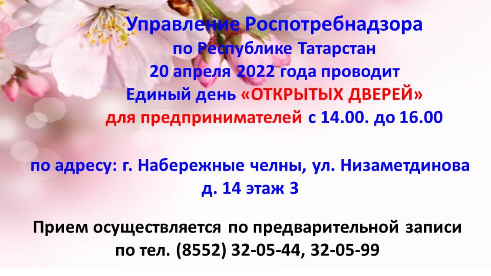 Татарстан Республикасы буенча Роспотребнадзор идарәсе 2022 елның 20 апрелендә 14.00 сәгатьтән 16.00 сәгатькә кадәр эшкуарлар өчен бердәм «Ачык ишекләр» көне үткәрә.