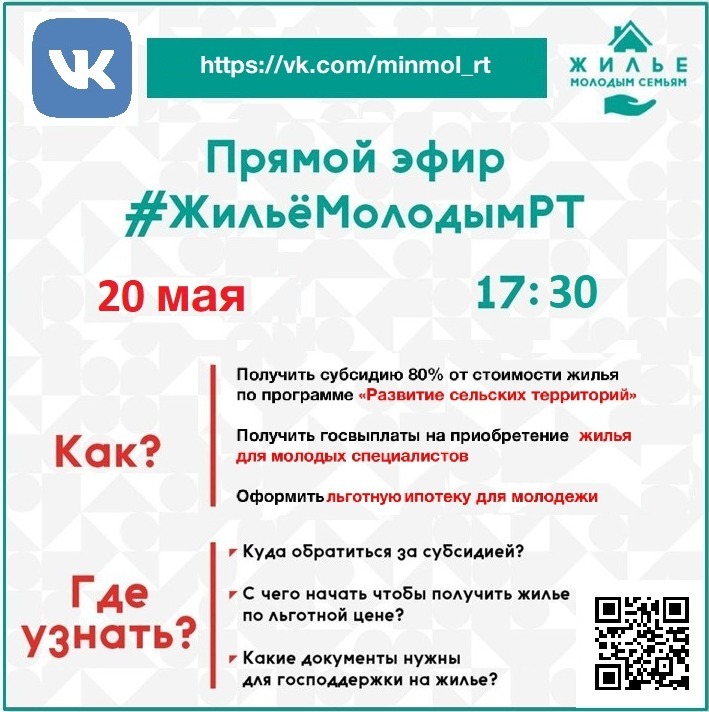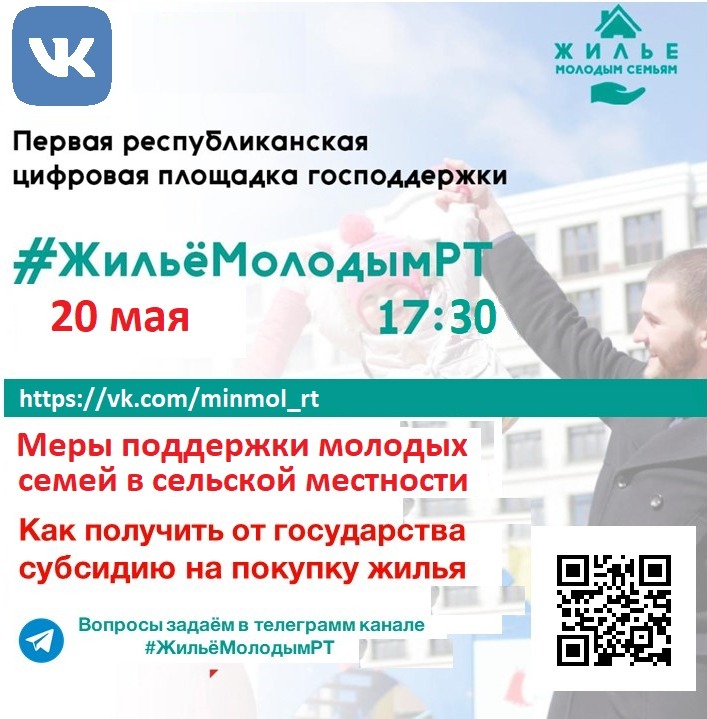 Татарстан Республикасы Яшьләр эшләре һәм спорт министрлыгы, Татарстан Республикасы Авыл хуҗалыгы һәм азык-төлек министрлыгы белән берлектә, ВКонтакте социаль челтәрен трансляцияләгән #ЖильёМолодымРТ туры эфирын уздыра. 2022 елның 20 мае, 17.45.