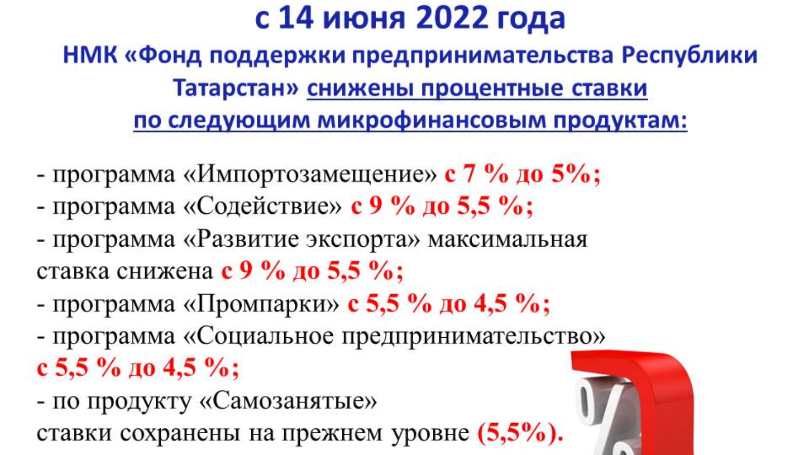 2022 елның 14 июненнән Татарстан Республикасы Икътисад министрлыгына караган «Татарстан Республикасы Эшкуарлыкка ярдәм итү фонды» коммерциячел булмаган микрокредит компаниясе микрофинанс продуктлары буенча процент ставкаларын киметте