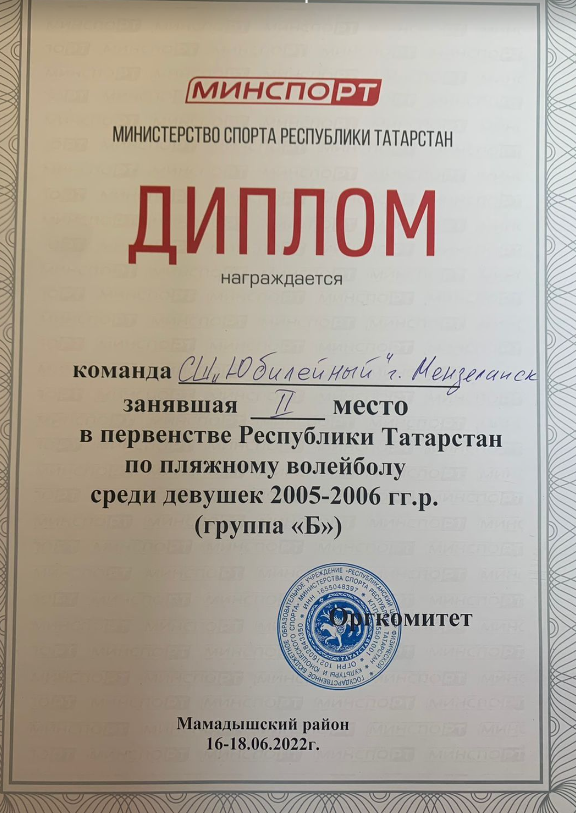 2022 елның 16-18 июнендә Мамадыш районының Соколка авылында 2005-2006 елларда туган кызлар һәм егетләр арасында пляж волейболы буенча Татарстан Республикасы Беренчелеге булып узды. Ярышларда Алабуга, Тәтеш, Мамадыш, Теләче, Сарман һ. б. шәһәрләреннән 15 команда катнашты. Зәринә Әбударова һәм Наилә Хәмитова-4 урын.