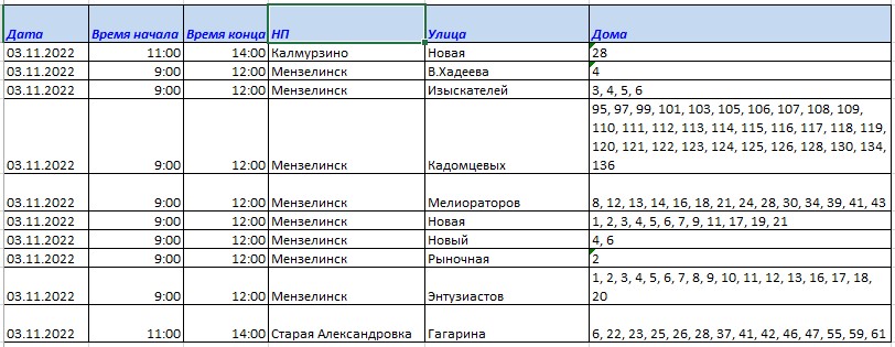 Хөрмәтле минзәләлеләр! 2022 елның 03 ноябре, сәгать 09.00 - 14.00. төзекләндерү эшләре бару сәбәпле адреслар буенча электр энергиясен өзү планлаштырыла: