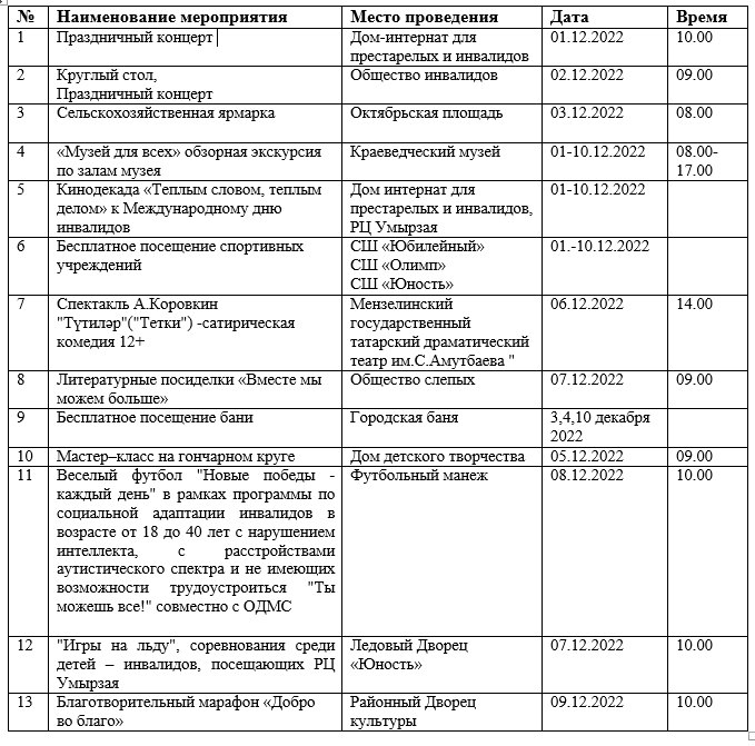 Декабрь башы гадәттәгечә мөмкинлекләре чикле кешеләр ункөнлеге буларак билгеләп үтелә. Ул Халыкара инвалидлар көненә багышланган, БМО карары буенча 1993 елдан 3 декабрьдә билгеләп үтелә.