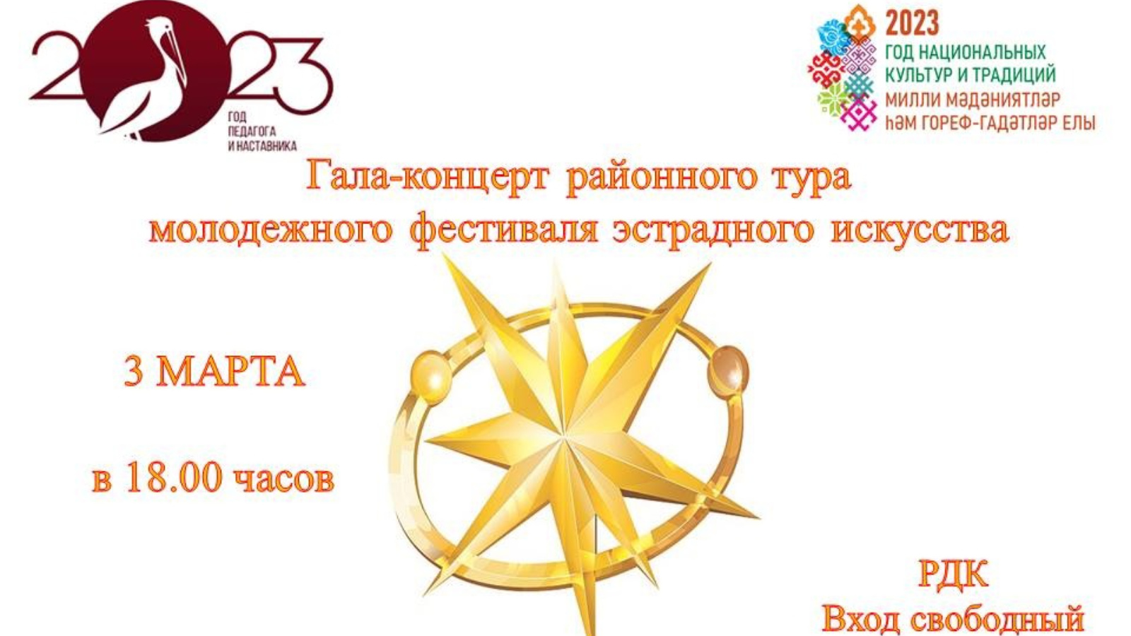 Сезне «Созвездие-Йолдызлык-2023» эстрада сәнгатенең XXIII еллык ачык республика телевизион яшьләр фестиваленең район туры җиңүчеләренең гала-концертына чакырабыз.