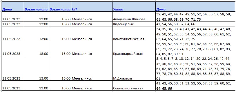 Хөрмәтле минзәләлеләр! 2023 елның 11 маенда 13.00 сәгатьтән 16.00 сәгатькә кадәр ремонт эшләре белән бәйле рәвештә электр энергиясе сүндереләчәк: