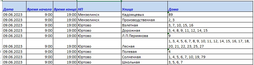 Хөрмәтле минзәләлеләр! 2023 елның 9 июнендә 09.00 сәгатьтән 19.00 сәгатькә кадәр ремонт эшләре белән бәйле рәвештә электр энергиясе сүндереләчәк: