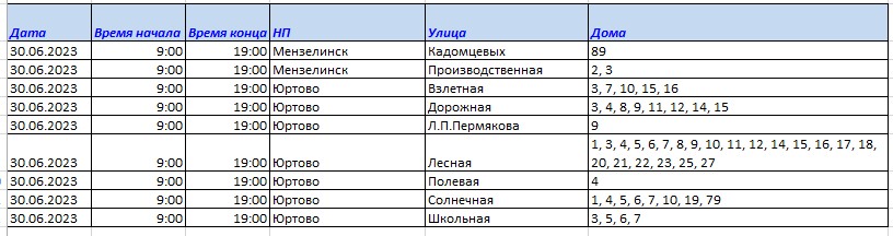 Хөрмәтле минзәләлеләр! 2023 елның 30 июнендә 09.00 сәгатьтән 19.00 сәгатькә кадәр ремонт эшләре белән бәйле рәвештә электр энергиясе сүндереләчәк: