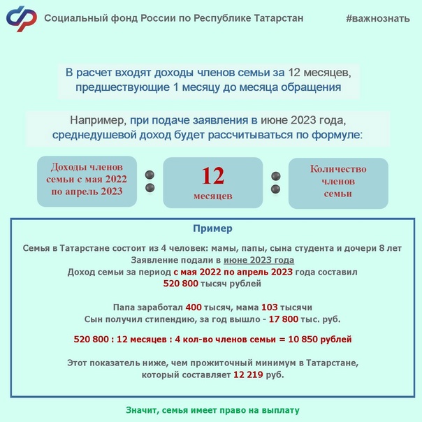 Бердәм пособие билгеләгәндә гаиләнең җан башына уртача кереме исәпкә алына — ул җан башына яшәү минимумыннан артмаска тиеш, Татарстан буенча ПМ 12 219 сум тәшкил итә.