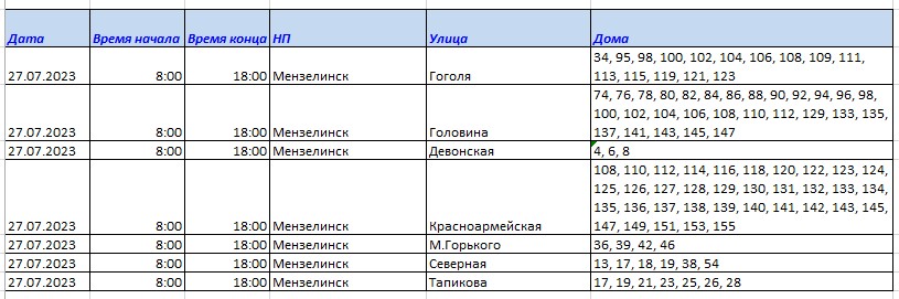Хөрмәтле минзәләлеләр!2023 елның 27 июлендә 08.00 сәгатьтән 18.00 сәгатькә кадәр ремонт эшләре белән бәйле рәвештә электр энергиясе сүндереләчәк: