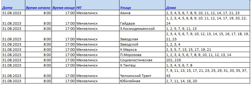 Хөрмәтле минзәләлеләр! 2023 елның 31 августында 08.00 сәгатьтән 17.00 сәгатькә кадәр ремонт эшләре белән бәйле рәвештә электр энергиясе сүндереләчәк: