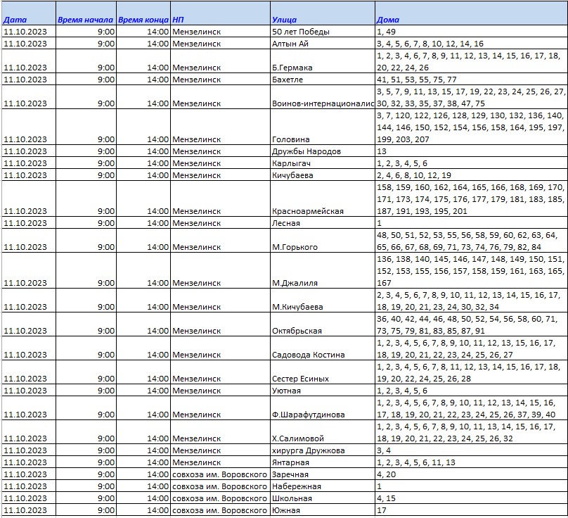Хөрмәтле минзәләлеләр!2023 елның 11 октябрендә 09.00 сәгатьтән 14.00 сәгатькә кадәр ремонт эшләре белән бәйле рәвештә электр энергиясе сүндереләчәк: