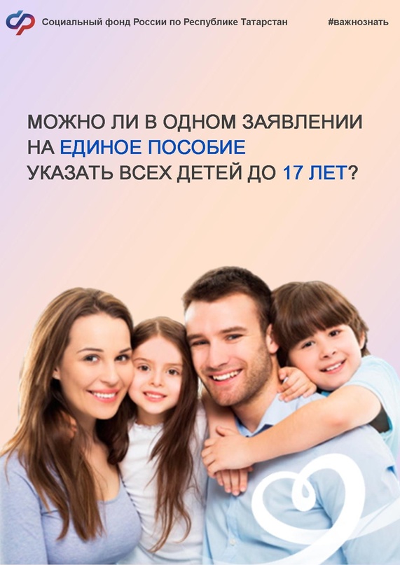 Әйе, 17 яшькә кадәрге гаиләдәге барлык балаларга бер генә гариза тутырып, бердәм пособие рәсмиләштерергә мөмкин.