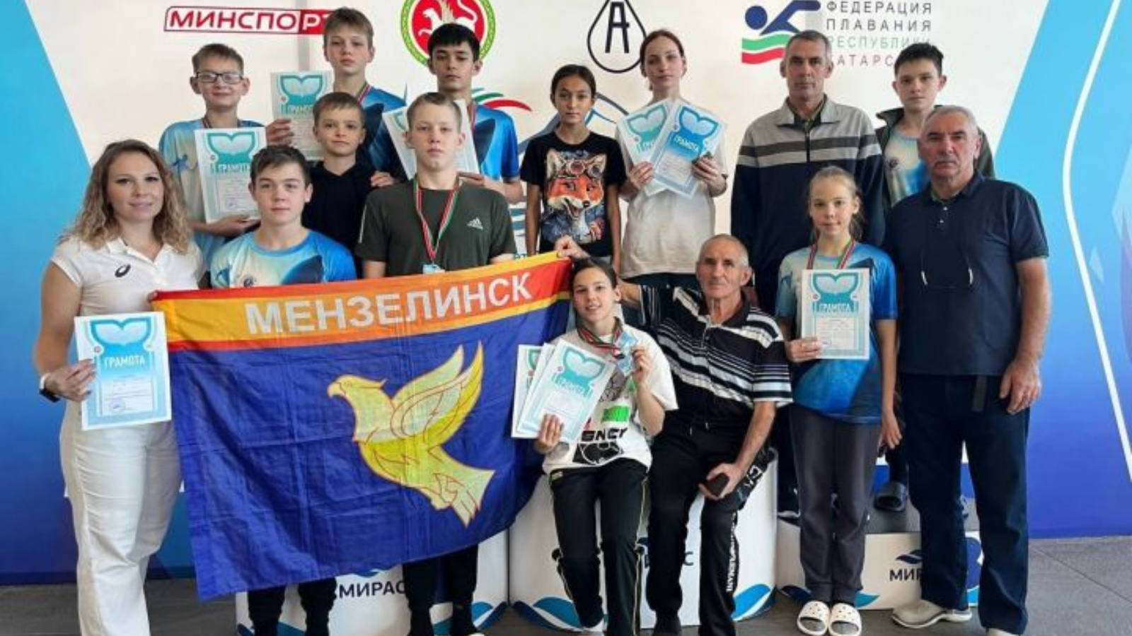 Минзәлә районы данын йөзү буенча тренерлар Н.Ф. Каюмов, А.Г.Сафиуллин, Ф. Р. Бәдриев «Юбилейный»спорт мәктәбенең тәрбияләнүчеләре яклады.
