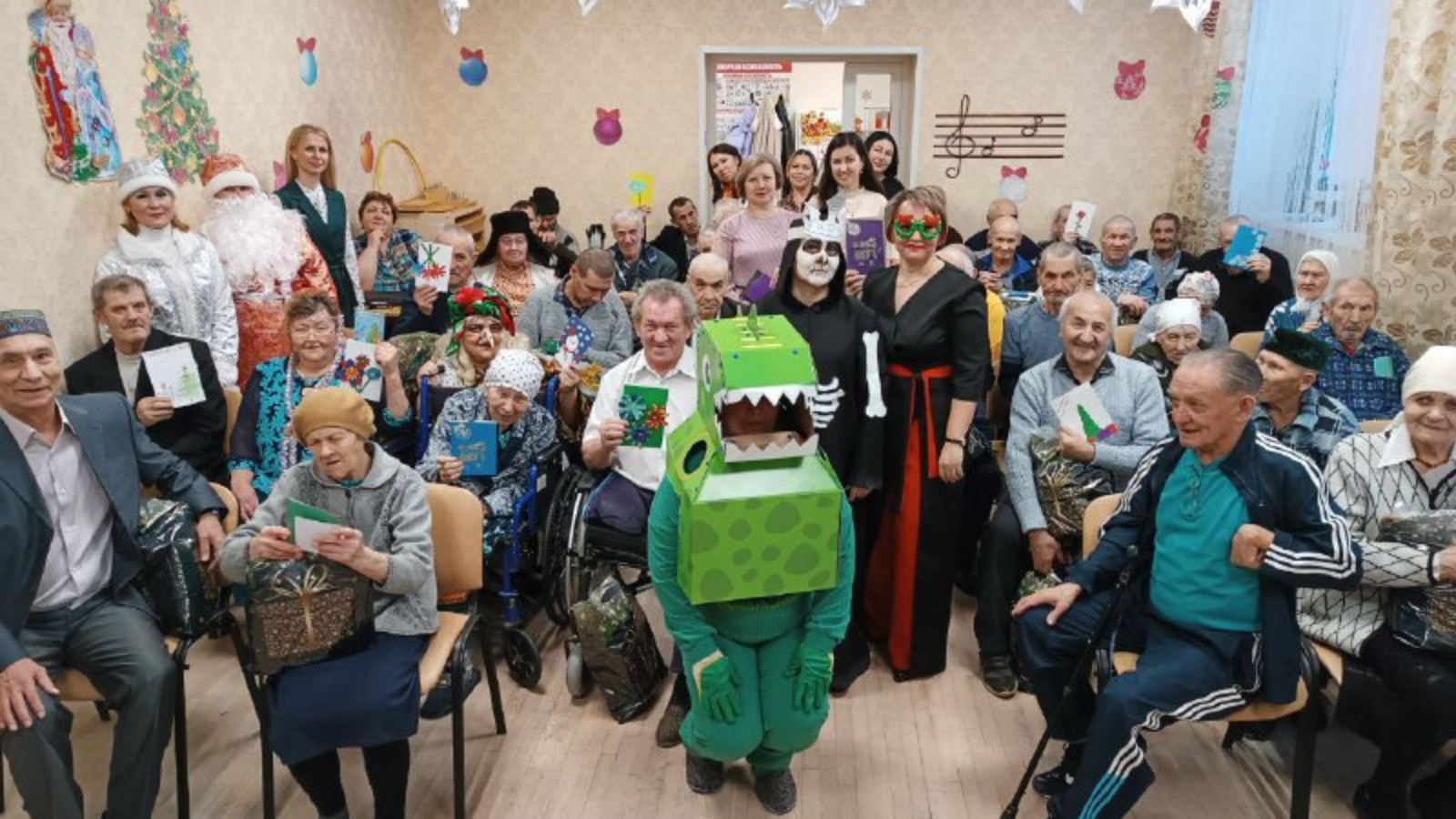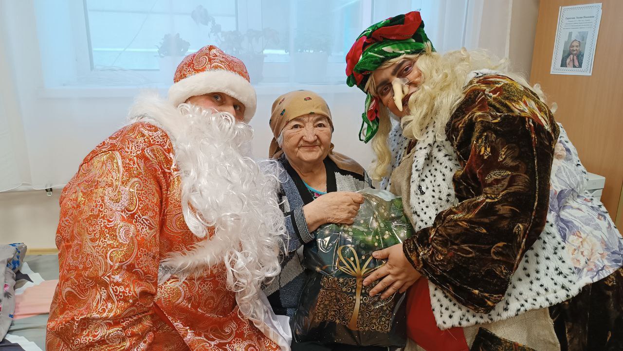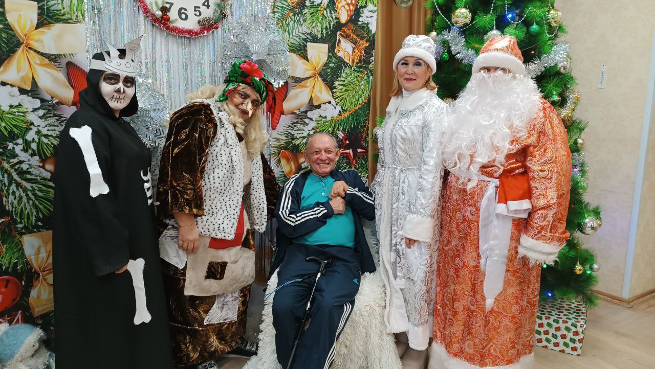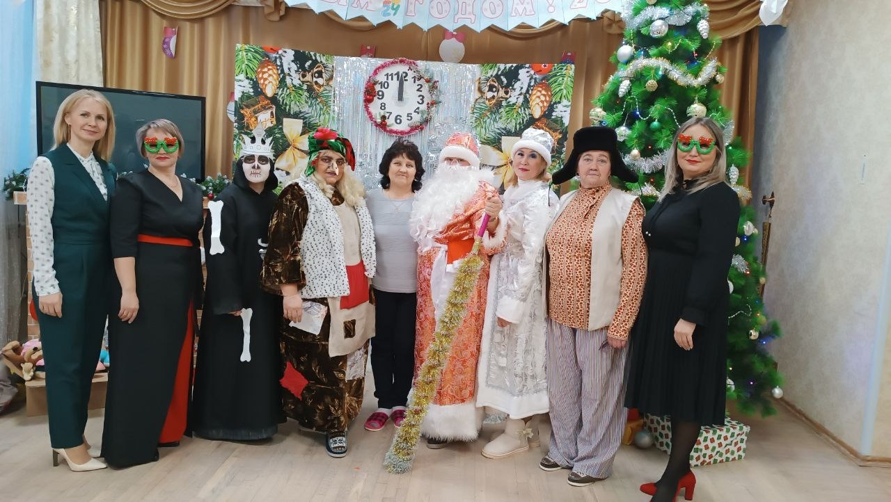 Социаль хезмәтләр алучыларны котларга район Башкарма комитеты җитәкчесе урынбасары Неля Бикеева һәм социаль яклау бүлеге башлыгы Татьяна Мясникова килде,алар ныклы сәламәтлек, баш өстендә аяз күк, җан тынычлыгы, җылылык һәм иртәгәсе көнгә ышаныч теләделәр. Хезмәткәрләр Яңа ел бәйрәмен үз көчләре белән үткәрделәр. Бу чын Яңа ел тамашасы иде. Чын артистлар кебек уйнап, коллектив тәрбияләнүчеләрне чын күңелдән шатландырды. Һәрбер кеше импровизацияләнгән сәхнәгә чыгып чыгыш ясый алган. Кыш бабай һәм Кар кызы, Үлемсез Кощей, Иске ел һәм Дракоша яшәүчеләр белән күңелле танышалар һәм күңел ачалар, ә хулиганка Бабе-Яга аларга яңа ел кәефен боза алмый. Кыш бабайның мобиль булмаган тәрбияләнүчеләрен Кар Кызы һәм әкияттәге озата баручылар белән бүлмәләрдә котладылар. Ахырда һәр кеше хәйрияче Бизянов Язкар Миңнулла улыннан татлы Яңа ел бүләге алды.