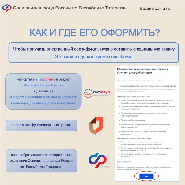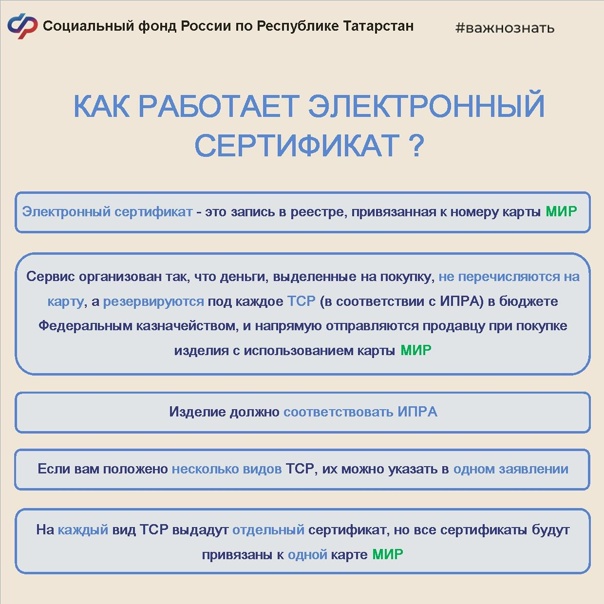 Электрон сертификат инвалидлар, ветераннар һәм җитештерүдә бәхетсезлек очракларыннан һәм һөнәри авырулардан зыян күрүчеләр өчен техник реабилитация чараларын (ТСР) алу ысулларының берсе.
