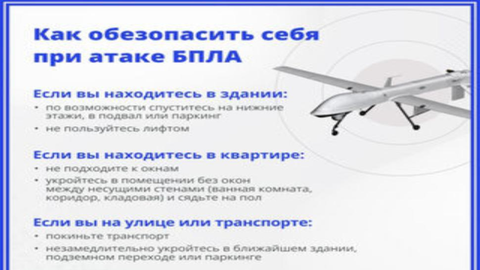 «Отбой атаки БПЛА» сигнал алганчы яшеренү урыныннан чыкмаска һәм аны ташлап китмәскә.