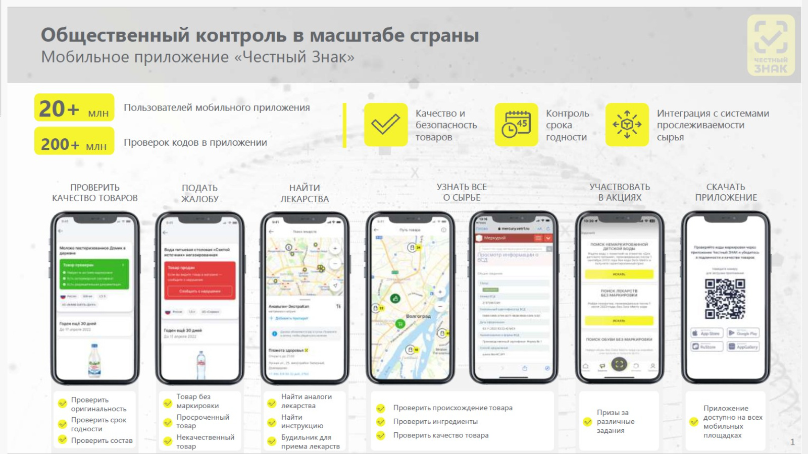 Честный ЗНАК мобиль кушымтасын куллану сатып алучыларны сыйфатсыз товарлардан һәм ялганнардан саклый, бу аеруча дарулар һәм башка халык куллану товарлары өчен мөһим.