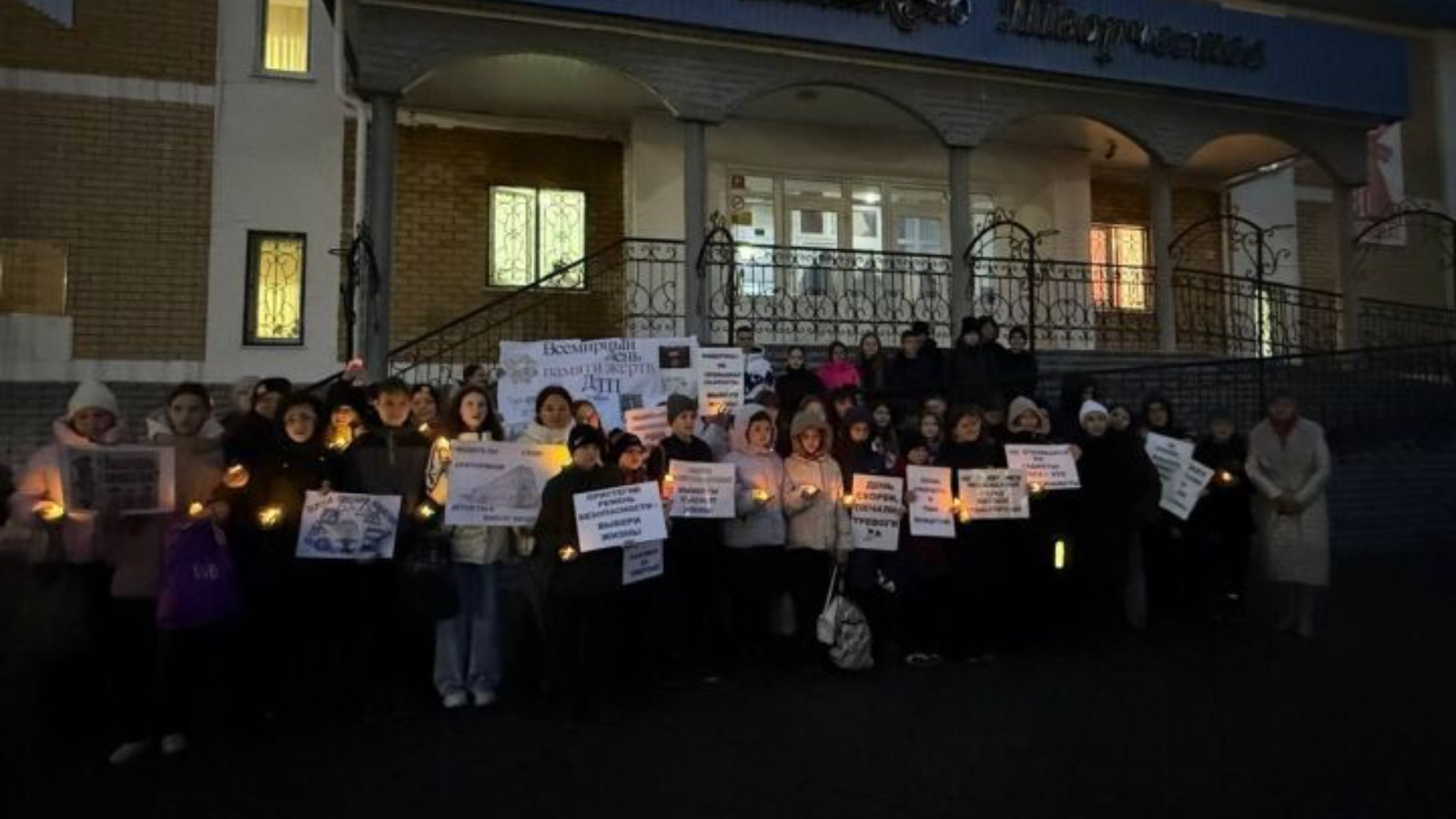 Чара юл-транспорт һәлакәтләрендә һәлак булганнарны искә алу өчен шәмнәр яндыру һәм плакатлар белән бер минут тынлык белән тәмамланды.