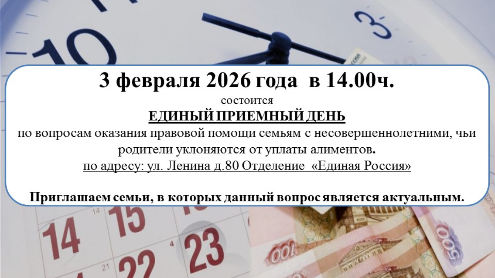 2026 елның 3 февралендә, 14 сәгатьтә, ата-аналары алимент түләүдән читләшүче балигъ булмаганнарның гаиләләренә хокукый ярдәм күрсәтү мәсьәләләре буенча Бердәм кабул итү көне уздырыла.